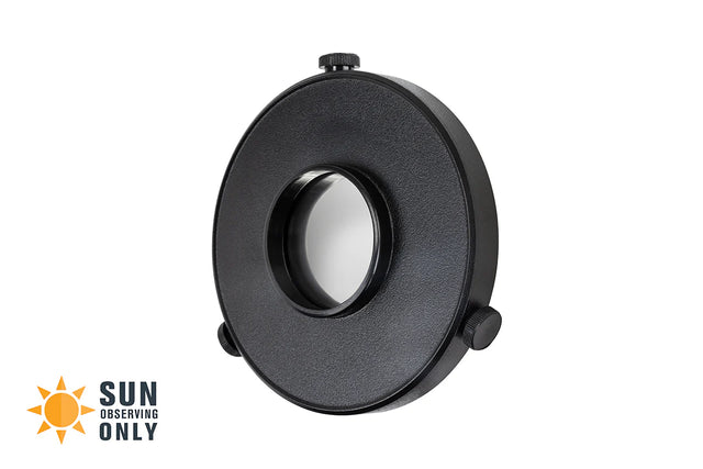 Tres tornillos de seguridad mantienen el filtro firmemente sujeto al objetivo del telescopio. Incluye una tapa protectora que resguarda la superficie externa del filtro cuando no está en uso.